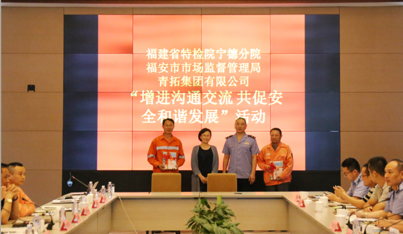 6月1日,由福建省特检院宁德分院、福安市市场监管局、青拓集团有限公司开展的“增进沟通交流,共促安全和谐发展”活动在青拓集团水上会议厅举行。福建省特检院宁德分院院长封影等20人,福安市市场监察局局长赵恒坚等10人,青拓集团总裁陈庆科、行政总经理钟盛江、发展计划部总经理邱丽平等40人出席活动。