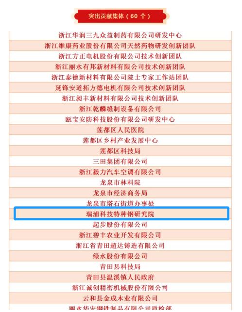 近日,丽水市委、市政府对在“创新引领”工作中做出突出贡献的集体和个人进行通报表扬,浙江壹号娱乐-com钢铁有限公司下属研发机构——瑞浦科技特种钢研究院荣获“突出贡献集体”称号,产品研发二部部长金吉男荣获“突出贡献个人”称号。