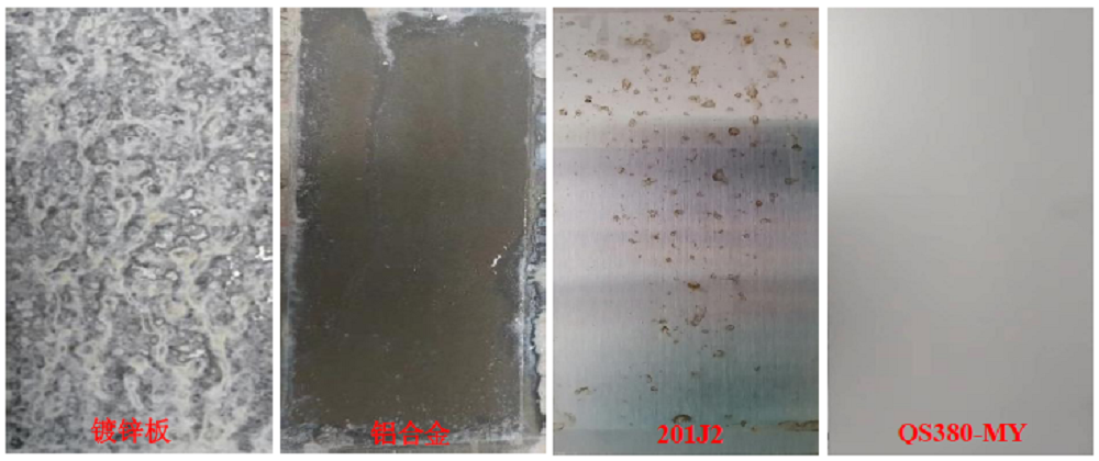 别墅外门长期暴露在日晒雨淋的户外环境中,在沿海地带常出现生锈现象,传统的镀锌板使用寿命不到五年。QS380-MY在中性盐雾条件下防锈时间达到600h,而镀锌板和铝合金则出现不同程度的锈蚀(白锈),201J2不锈钢材料表面出现红锈。显然,QS380-MY的耐蚀性能远优于镀锌板、铝合金以及201J2不锈钢,其使用寿命更长。